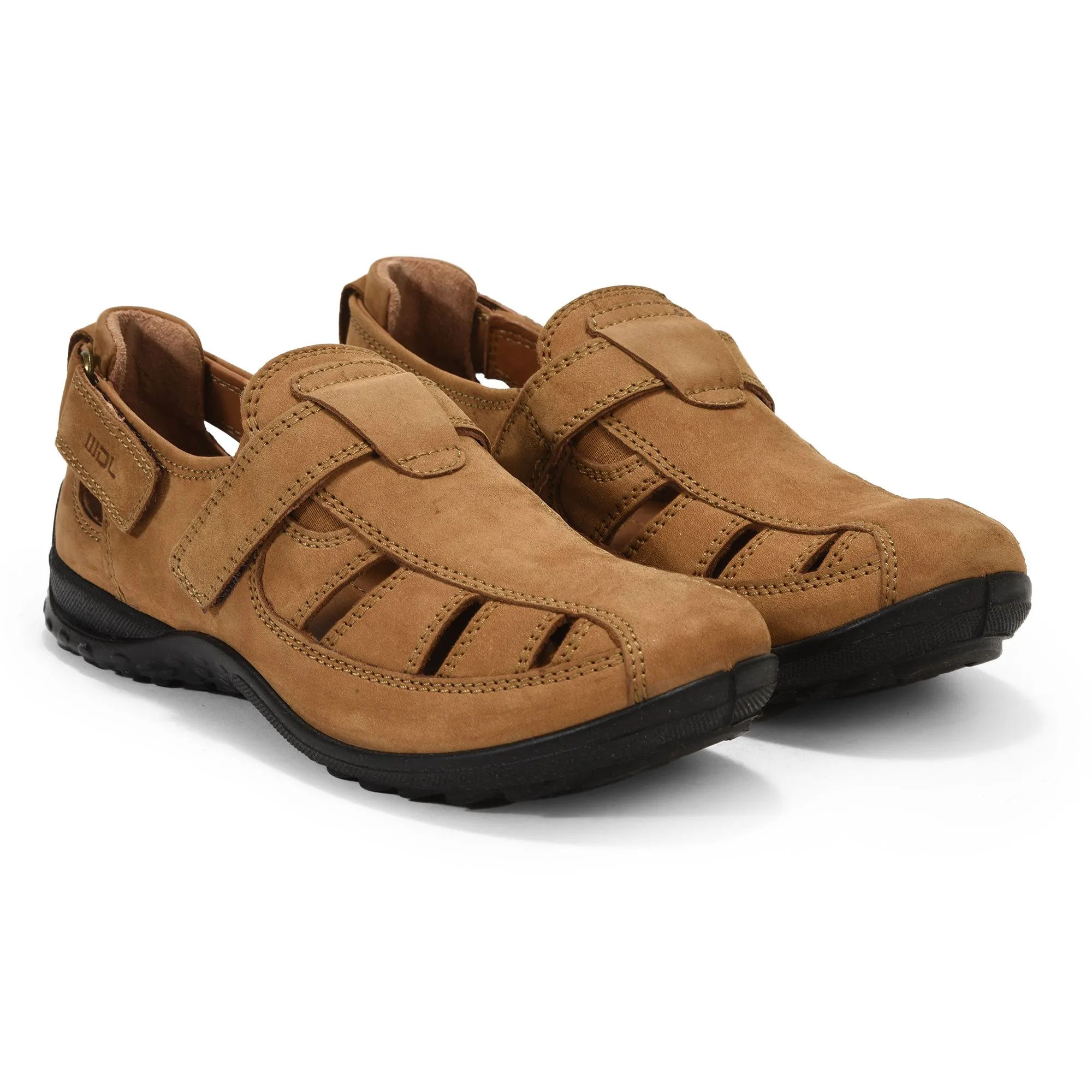 - Versatile camel sandal for everyday warm weather wear, the fisherman sandal or the closed toe sandal from Woodland comes in an easy slip-on style with an adjustable hook-and-loop closure strap. Designed from nubuck the sandal is set on a durable and flexible TPU/PU outsole and has leather with foam insole that conforms to the shape of your foot. The sandal for men also features cushioning on high abrasion areas and arched heel support. The sandal will surely keep your feet comfortable and well ventilated.