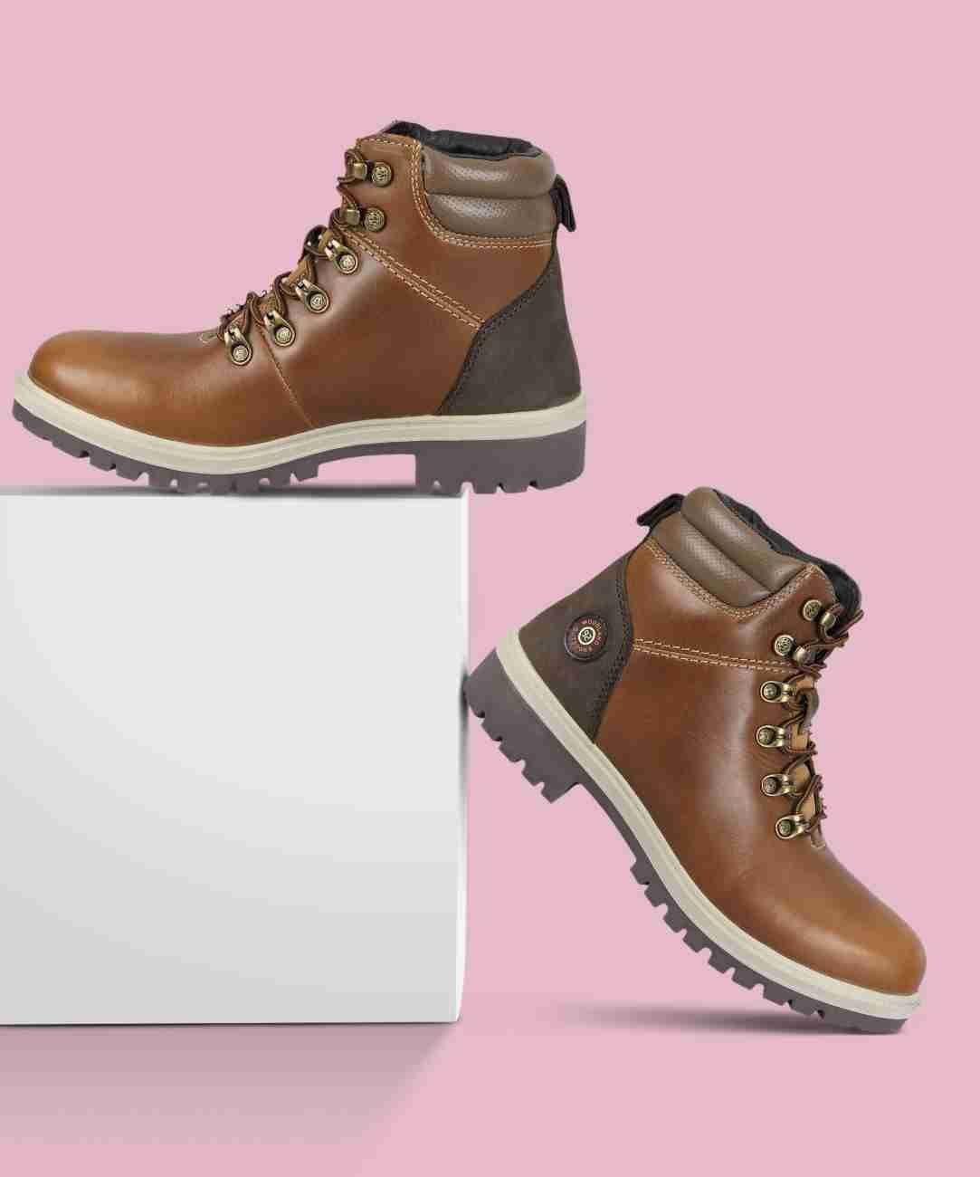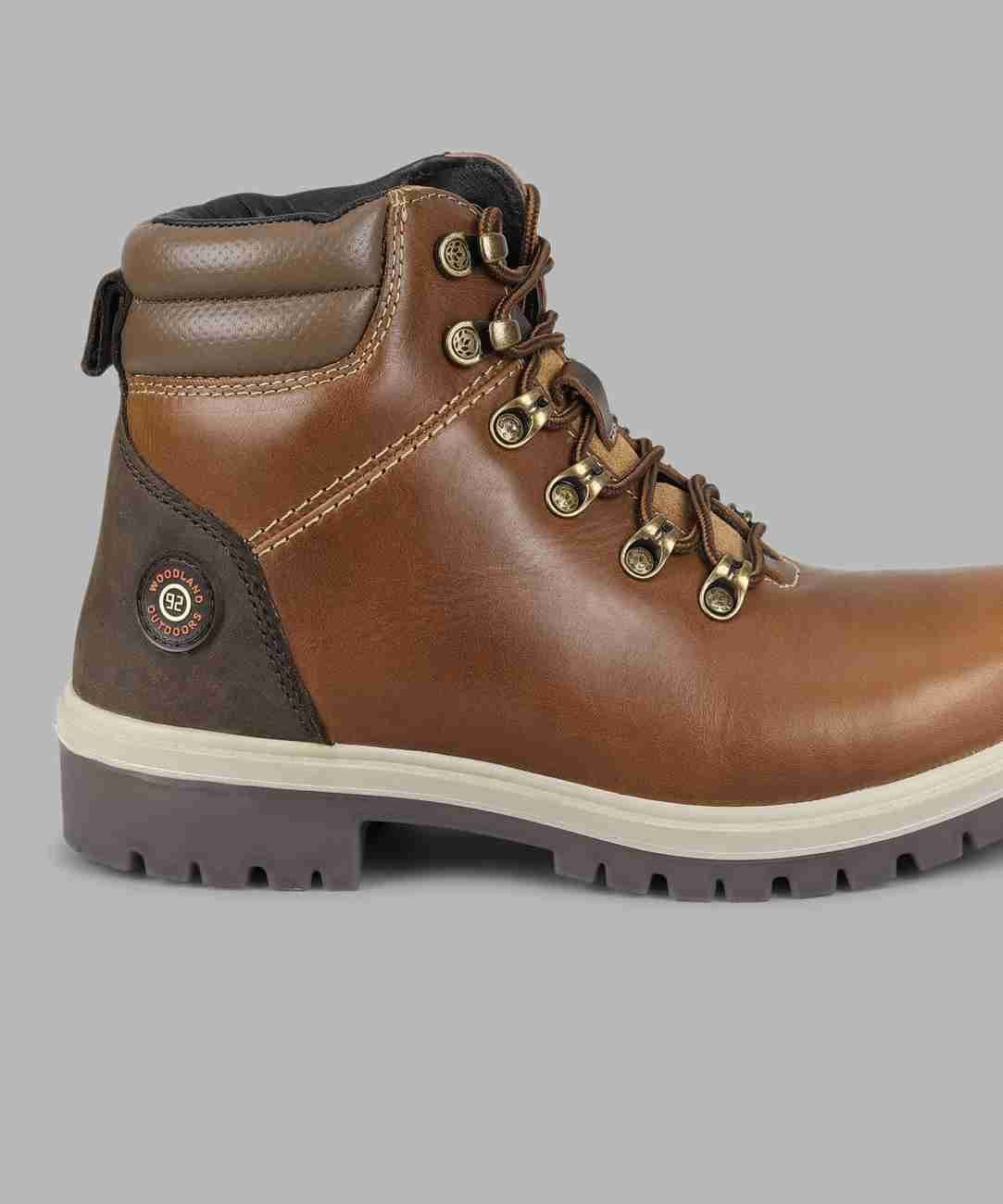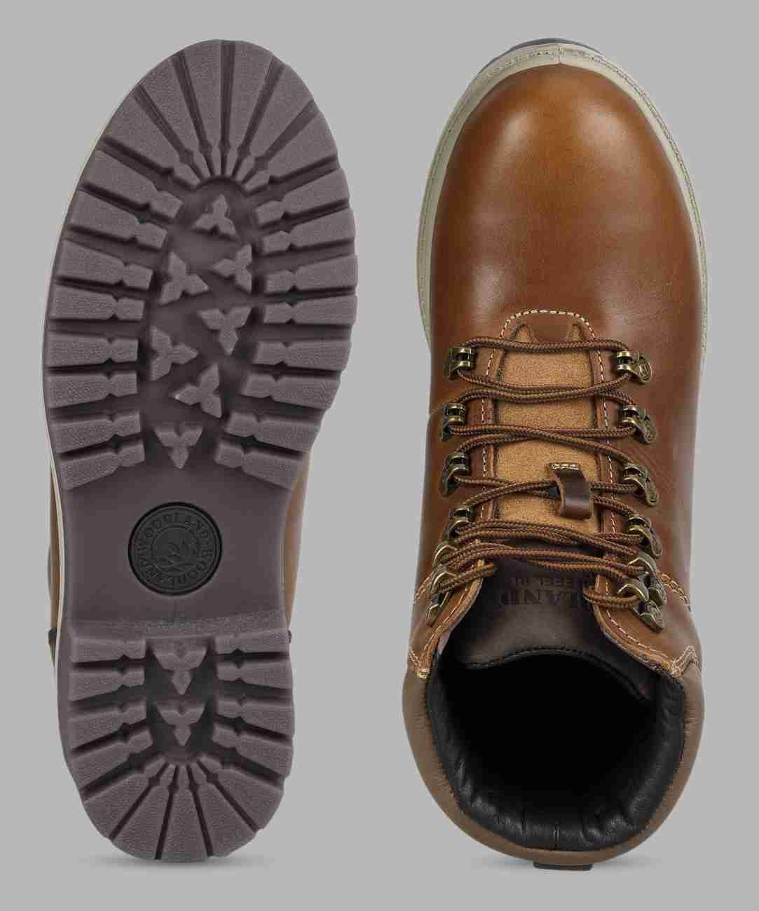 - Durable outsole with grippy treads gears you for all outdoor adventure in this robust boot crafted from a premium leather. The round-toe camel boot for men comes in a high-top silhouette, has d-ring metal eyelets, cushioned collar and tongue, pull tab on rear and is set on a stacked heel.