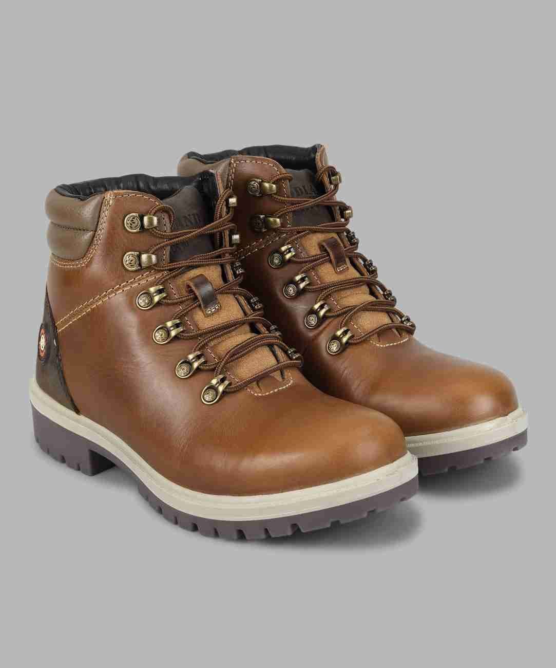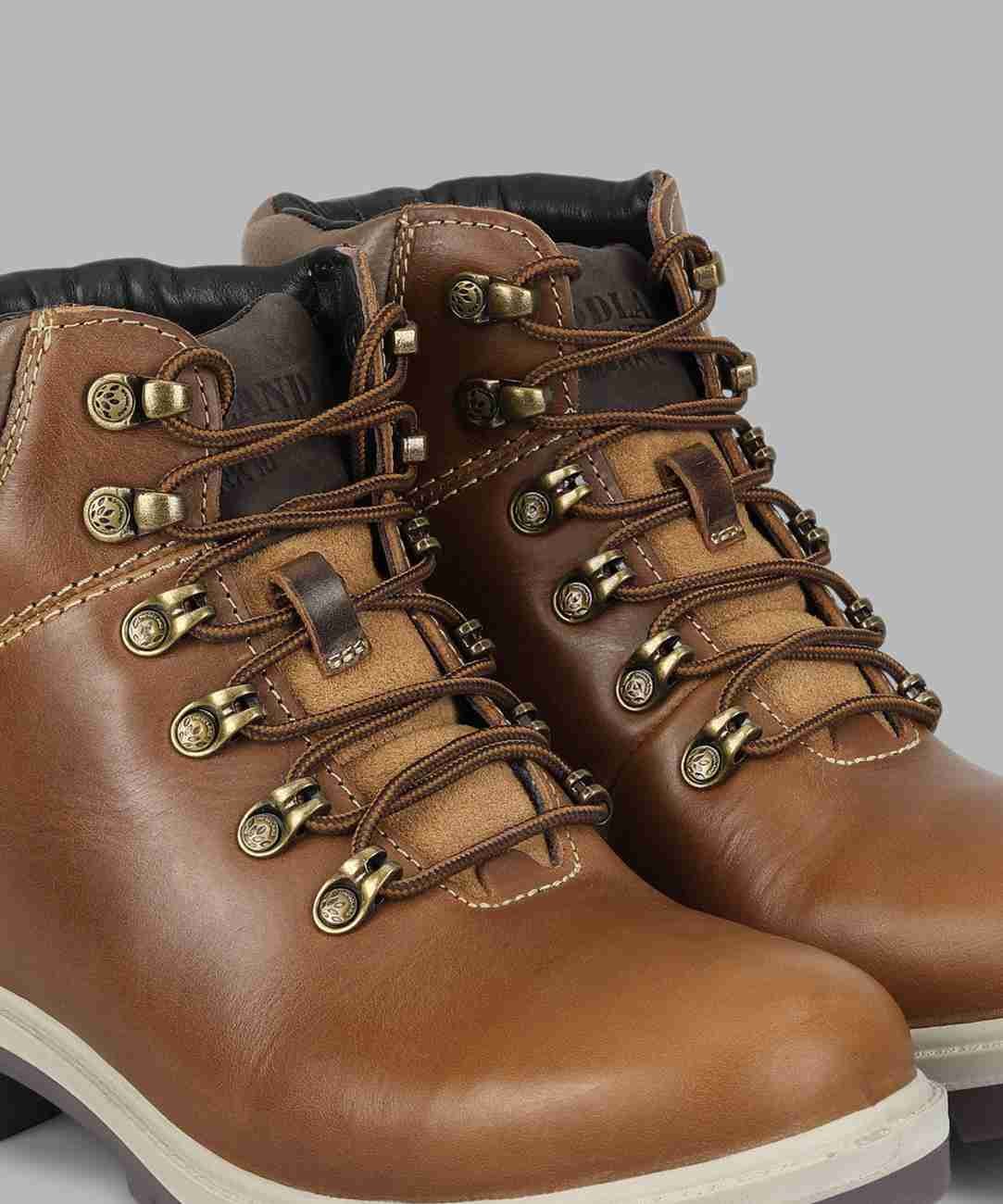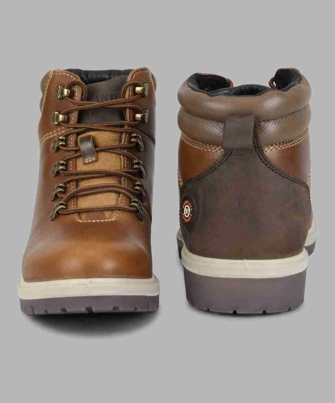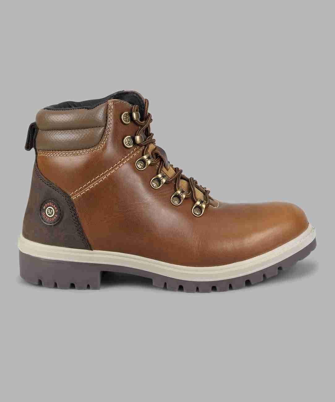 - Durable outsole with grippy treads gears you for all outdoor adventure in this robust boot crafted from a premium leather. The round-toe camel boot for men comes in a high-top silhouette, has d-ring metal eyelets, cushioned collar and tongue, pull tab on rear and is set on a stacked heel.