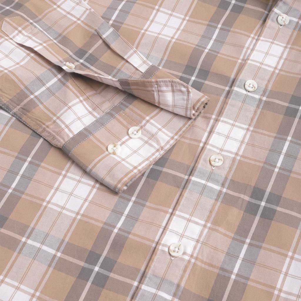 • A check pattern elevates the casual, comfortable vibe of a this beige shirt for men that can be layered easily and looks great untucked. The button-down shirt is finished with a shirttail hemline and looks great when worn with denims as well as chinos.